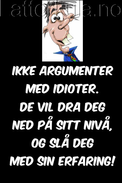 Ikke argumenter med idioter! Share Facebook Twitter Pinterest WhatsApp - Advertisement - - Advertisement - Kommentarer - Advertisement - Share Facebook Twitter Pinterest WhatsApp Siste nytt Videoer Se verdens FARLIGSTE og mest SINNSYKE vannsklier! -Annonse - Bildeserier Noe MÅ gjøres med det SKJULTE misbruket – Få FYLLA ut på gaten! Bildeserier Hadde du tenkt deg UT AV SKAPET i helgen? Videoer BRYLLUPS-bildene du aldri skulle trodd eksisterte! -Annonse - Related news Bilder Verdens sykeste og ekleste selfies !!! Bilder Angret på navnetatoveringen – Dette er bare helt sykt! Bilder 29 svært uheldige og PINLIGE situasjoner for den kongelige garde! Bilder Helt vanvittig og ekstremt rotete rom - Advertisement - Kommentarer